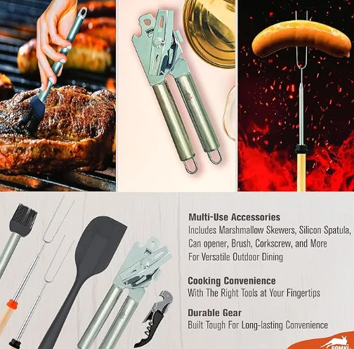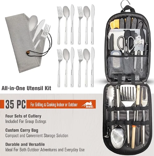 Isikhwama sokugcina samatende ekhekhe wangaphandle lokhu kupheka amatende okupheka amatende angama-35 kuyisisombululo esiphelele sezidingo zakho zokupheka zangaphandle. Kubandakanya isethi ekhishini ekhishini ekhempini ebekiwe nokupheka amatende okupheka, konke kugcwele kahle esikhwameni esingokwezifiso ezinamaphakethe angeziwe namaphakethe amabili angemuva. Isethi yenzelwe ukunakekela zonke izinto ezibalulekile zokupheka zamatende, okwenza kube yingezo elisemqoka kumagiya akho etende