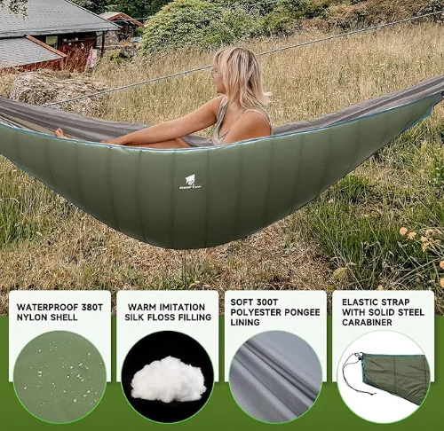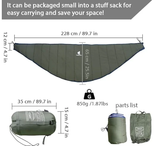 Izinkathi ezi-3 - 4 zeHammock Quilt zilungele amazinga okushisa asuka ku-41 ° F kuye ku-68 ° F; Kubunjwe kahle ukulingana nge-Hanging a Hammock, okukuvikela emoyeni futhi kukugcina ukhule ngemfudumalo.